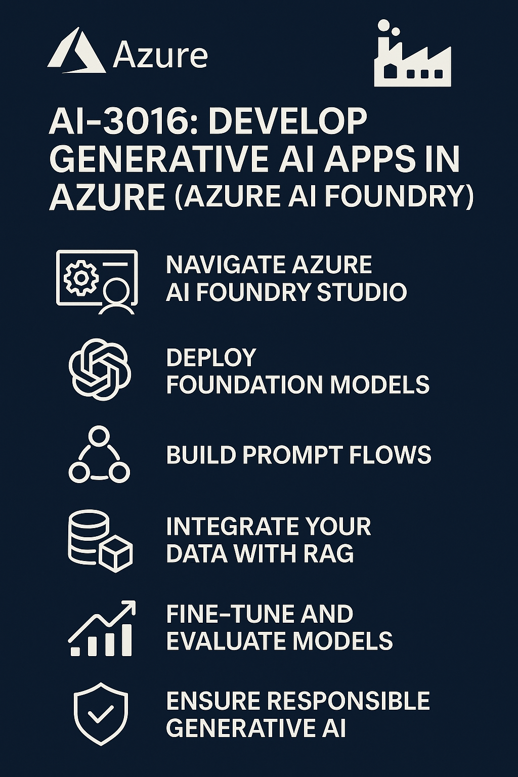 With the rapid evolution of Azure’s AI offerings, Microsoft and its training partners have introduced courses to skill up professionals. One notable training is “Develop Generative AI Apps in Azure (AI-3016)”, which is a one-day intermediate course focused on building custom copilots using Azure’s platform (Azure AI Studio/Foundry). This course (code AI-3016) which is Microsoft AI-3016 training teaches participants how to use Azure’s generative AI tools to create applications that use LLMs to converse with users, often referred to as custom copilots. According to the course outline, students get hands-on experience with the full AI app lifecycle: selecting and deploying models from the Azure AI model catalog, developing prompt flows, implementing retrieval-augmented generation (RAG) with their own data, fine-tuning models, and ensuring responsible AI practices. In other words, it’s a crash course in Azure AI Studio/Foundry features – covering how to ground a GPT model on enterprise data, how to build and test a conversational client, how to fine-tune or customize models, and how to evaluate and optimize the AI’s performance. The target audience is typically data scientists, AI engineers, and developers looking to create custom AI solutions on Azure.